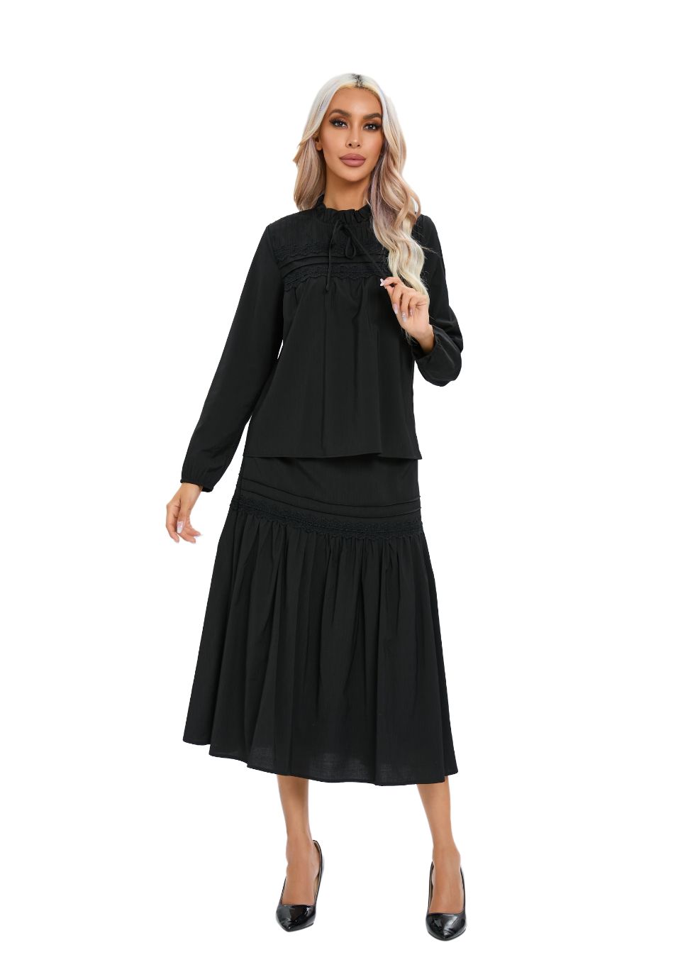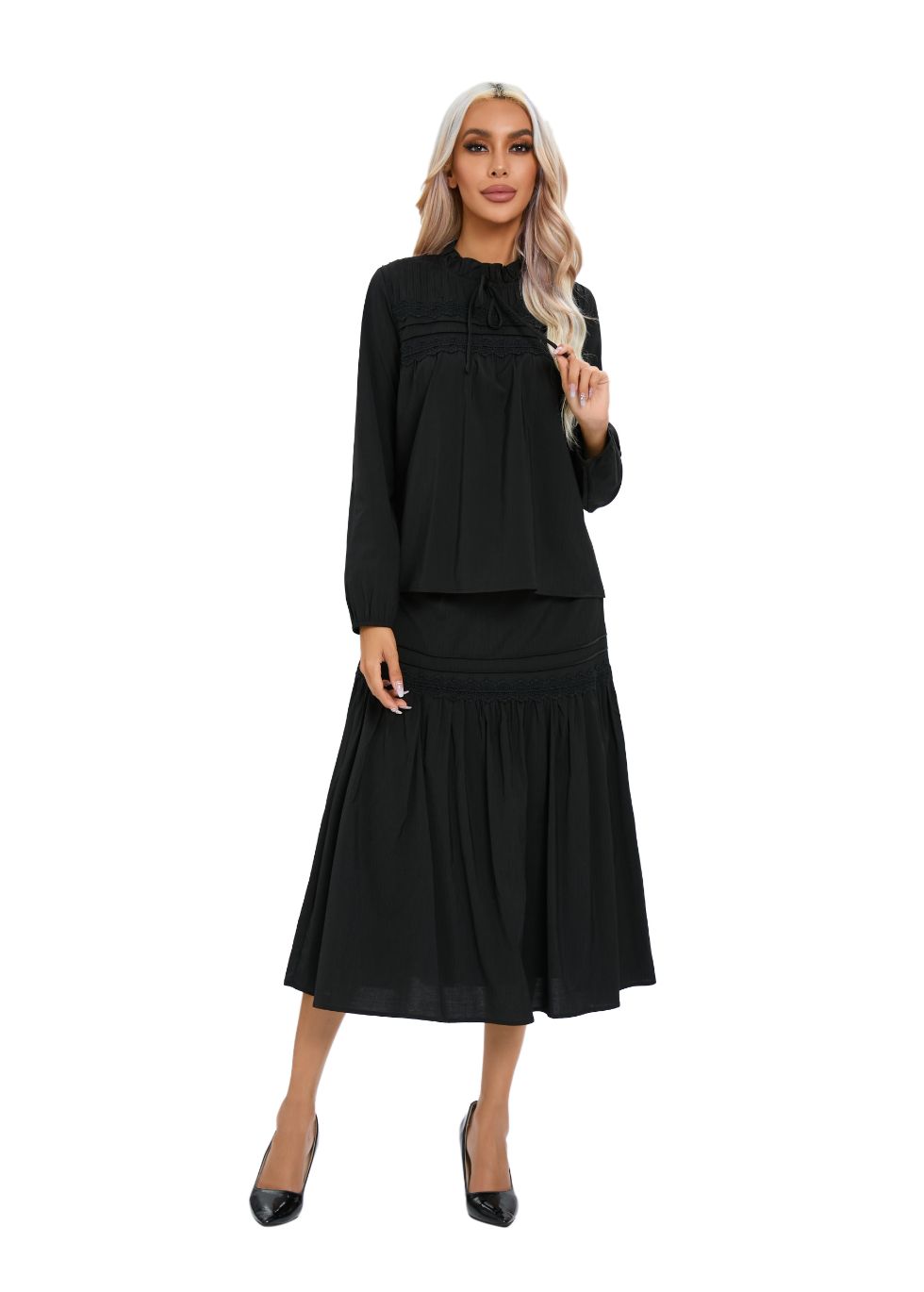 The top features a beautiful lace detail that adds a touch of femininity to the outfit, while the skirt falls gracefully to a midi length, creating a flattering silhouette. This set is available in two versatile colors – black and ivory – so you can choose the one that best suits your personal style.