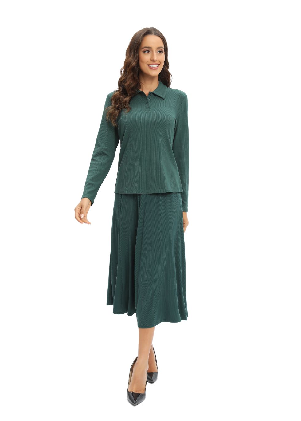This two-piece set is crafted with a soft and breathable jersey fabric for all-day comfort. The classic polo shirt features long sleeves, and the flare skirt adds a stylish touch. Enjoy comfort and a timeless look with this two-piece set!
