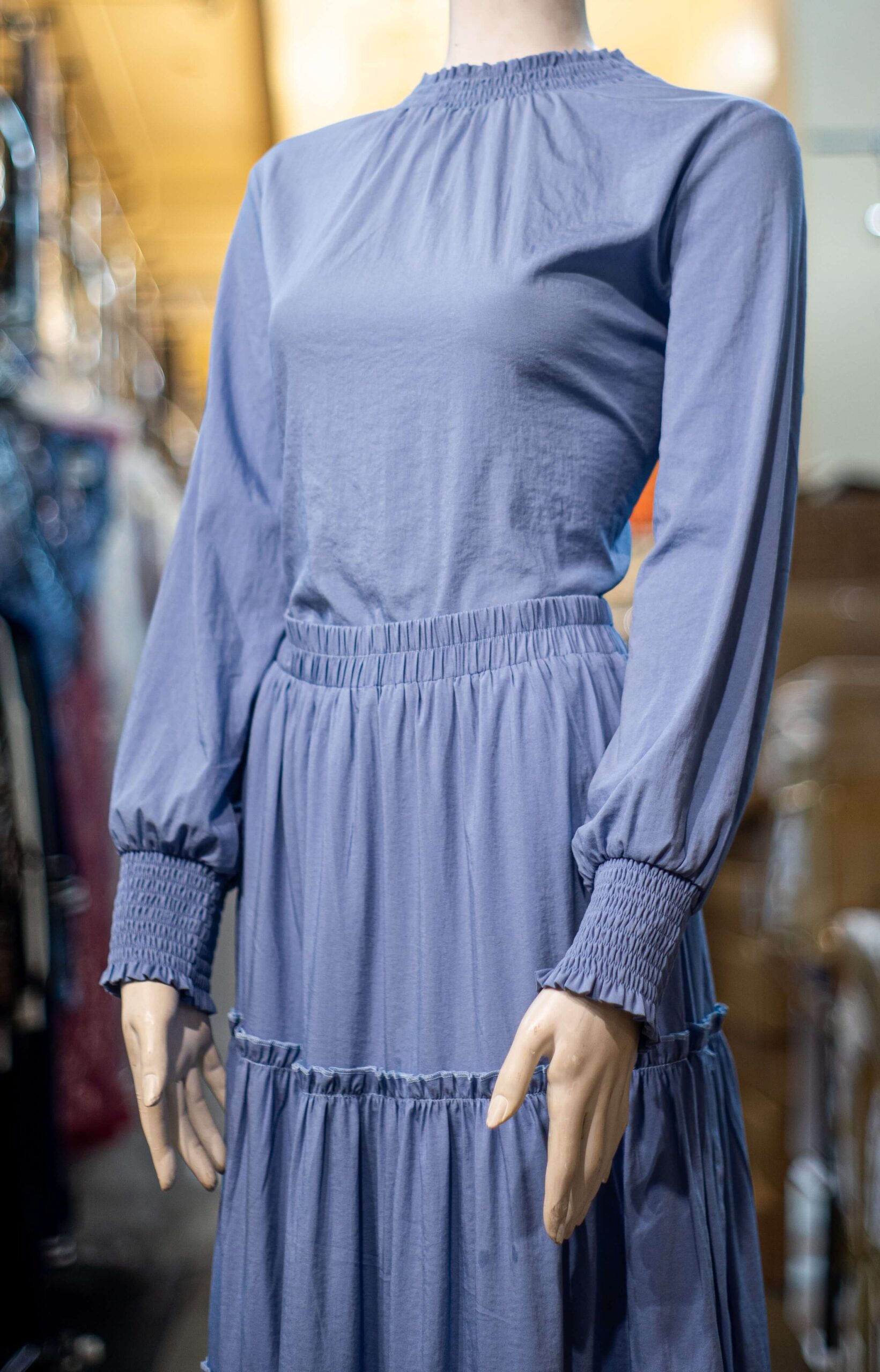 The set is made from a lightweight and breathable fabric that drapes beautifully, ensuring that you look and feel your best throughout the day. The modest neckline and long sleeves make it perfect for conservative settings, while the tiered skirt adds a touch of fun and sophistication.